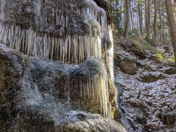 Das Schnittlinger Loch und die Massendorfer Schlucht zeigen eine andere Seite des Altmühltals. Tief eingeschnittene Wege, feuchte Felswände, schattige Passagen – im Winter verwandeln sich diese Orte in Eislandschaften mit langen Zapfen, die wie kristalline Vorhänge herabhängen.